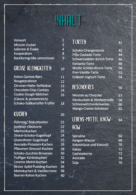 Dennoch sind die Rezepte sind entweder glutenfrei oder enthalten Dinkelmehl (1050er oder Vollkornmehl). Der verwendete Zucker ist natürlich frei von dir wählbar – im Kochbuch arbeite ich mit Birken-, Vollrohr- und Kokosblütenzucker, Reis- & Ahornsirup, sowie selbstgemachter Dattelcreme.