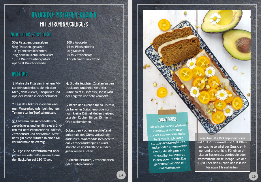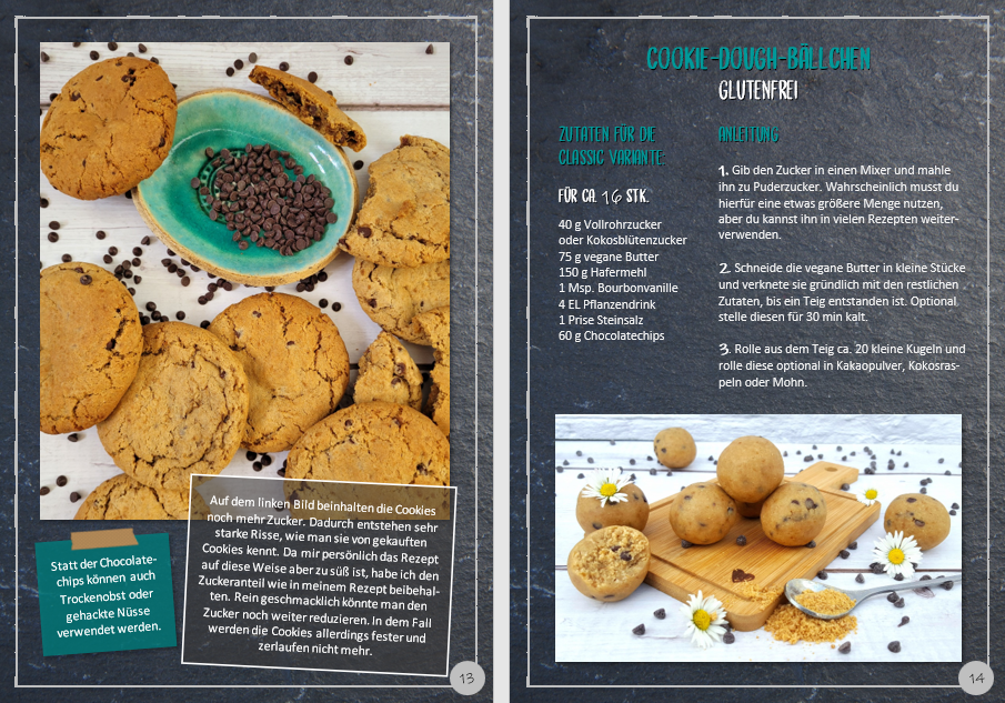 Dennoch sind die Rezepte sind entweder glutenfrei oder enthalten Dinkelmehl (1050 er oder Vollkornmehl). Der verwendete Zucker ist natürlich frei von dir wählbar – im Kochbuch arbeite ich mit Birken-, Vollrohr- und Kokosblütenzucker, Reis- & Ahornsirup, sowie selbstgemachter Dattelcreme.