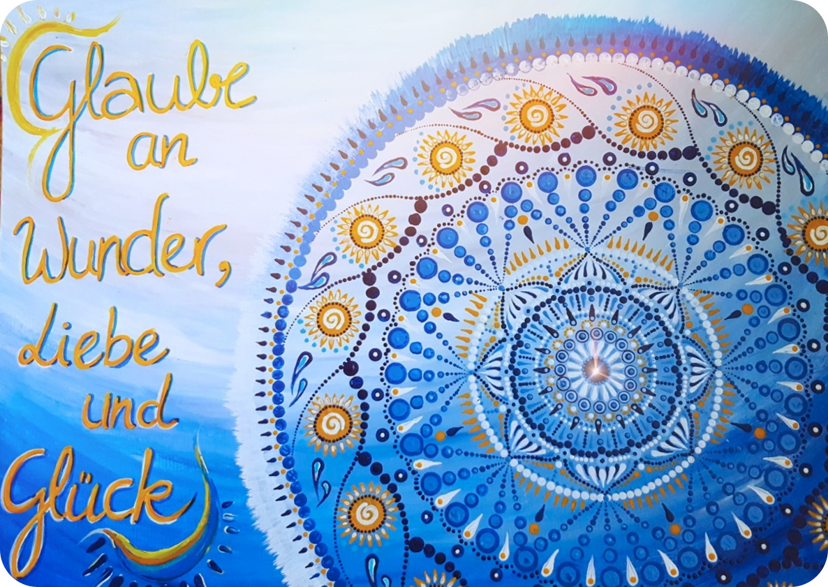 Motiv „Glaube an Wunder“ mit Heilmandala in Blau- und Gelbtönen.