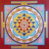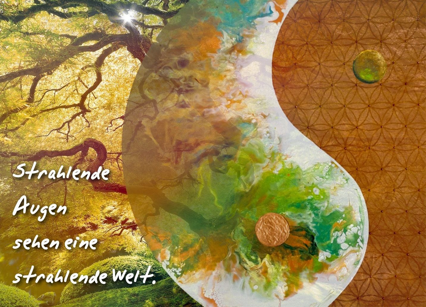 Motiv „Strahlende Welt“ mit Yin & Yang in Naturfarben Weiß, Grün, Braun und Bronze. Die eine Seite beinhaltet fließende Farben, die andere die heilige Geometrie der Blume des Lebens.